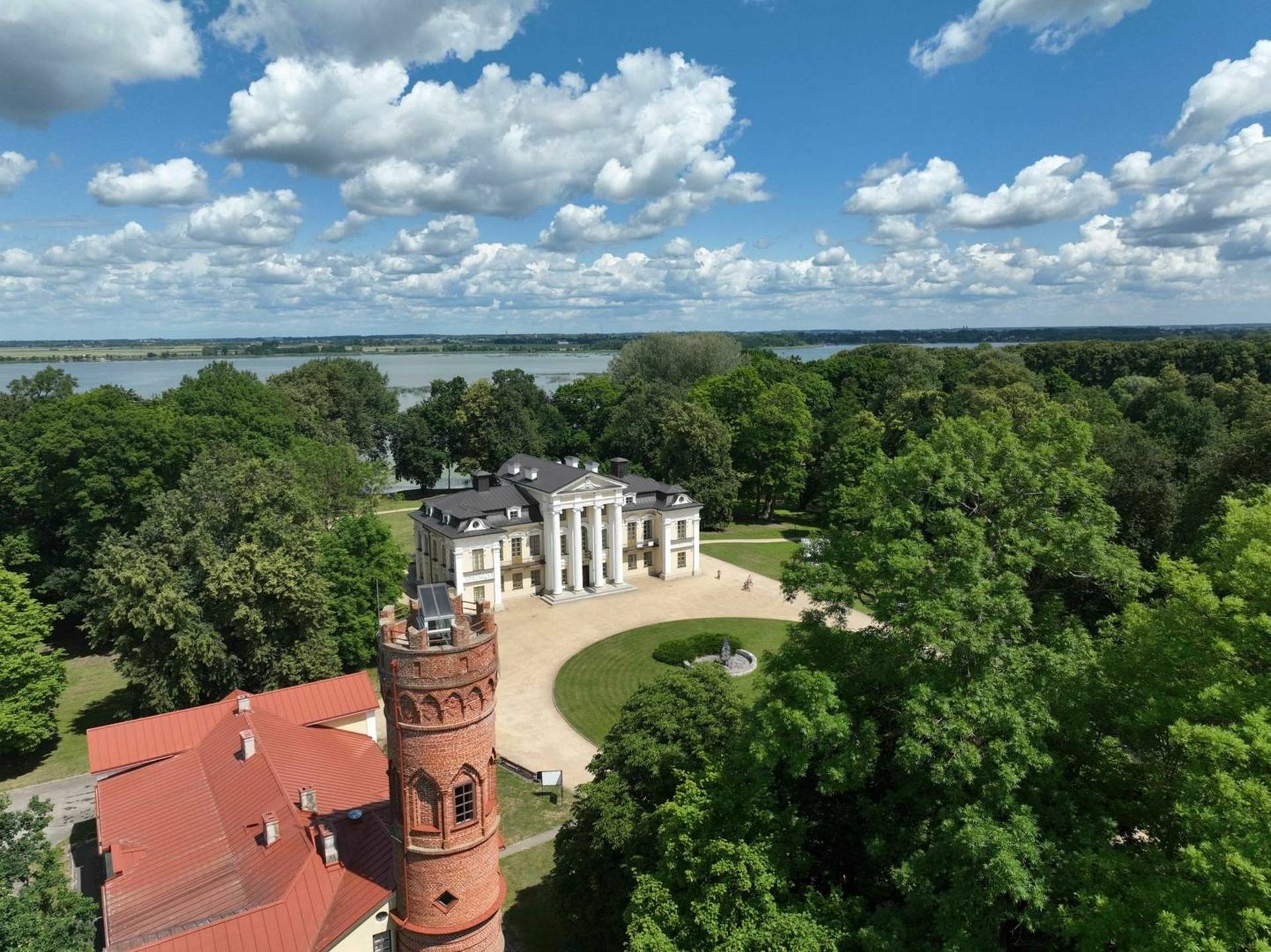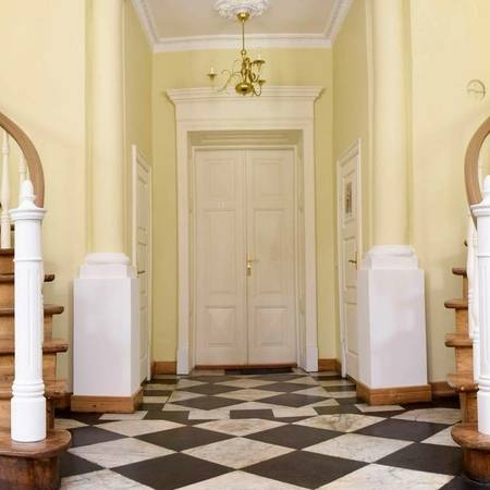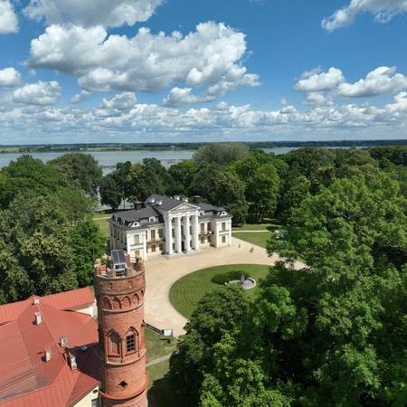 The manor complex is one of the most prominent examples illustrating the transition from Baroque to Classicism. The stylish palace was designed by the famous architect Martynas Knakfusas, and the Romantic-style office building with a Belvedere tower, built in the 19th century, still enchants today. The 12-hectare park with linden alleys, ponds, and remnants of an orangery creates a special atmosphere. Nearby grows an old oak, bearing witness to the once extensive forests.